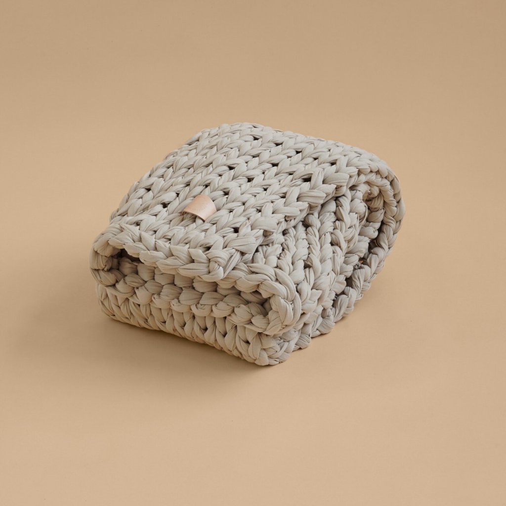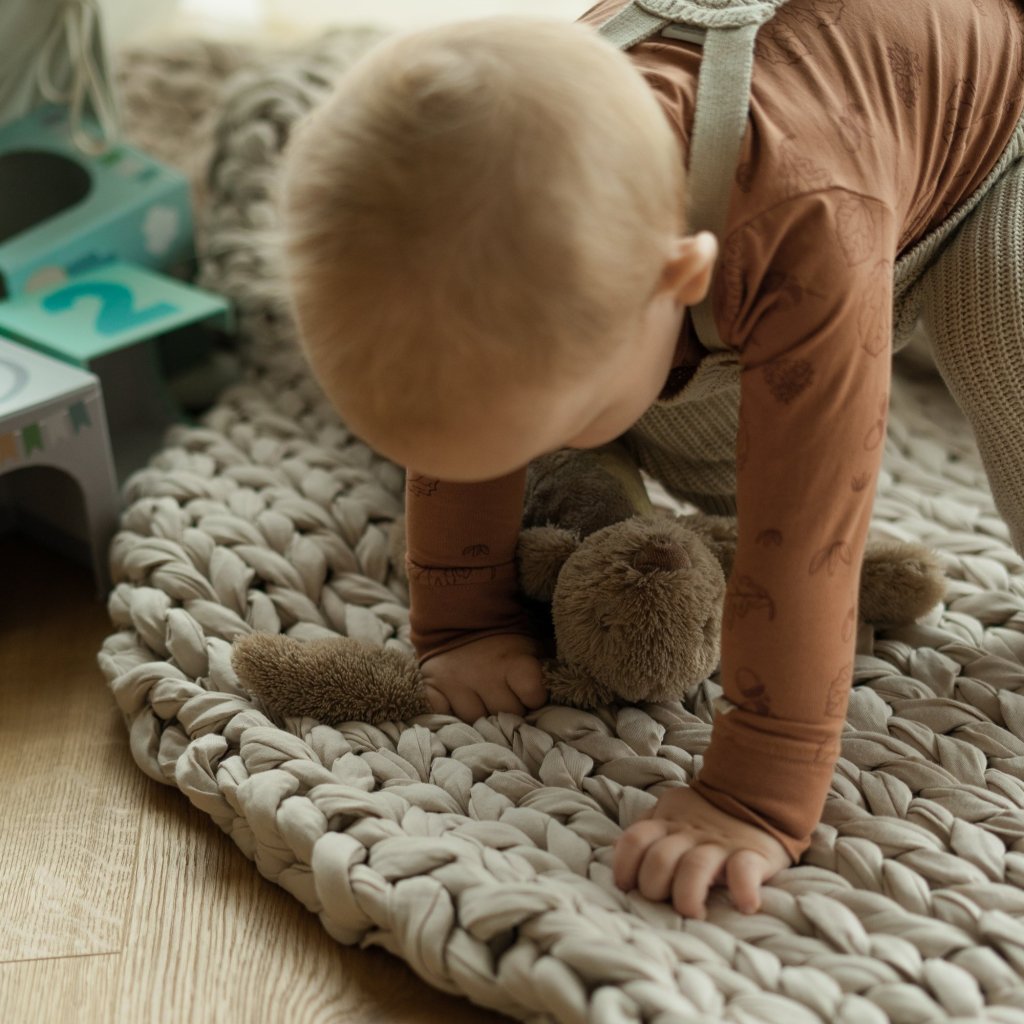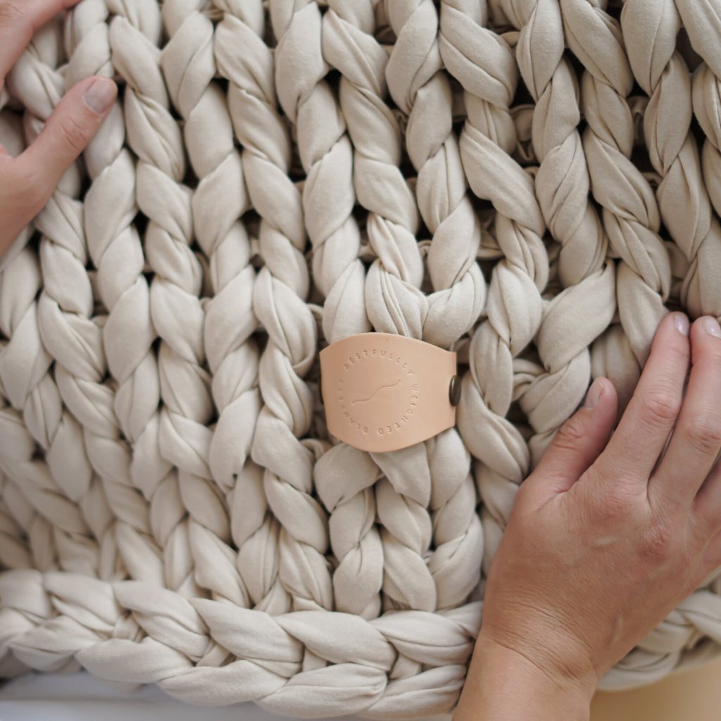 Tato světle béžová dětská zátěžová deka je upletená z asi 4 kilogramů jemné bavlněné příze. Je prodyšná, příjemná na dotek a neuvěřitelně uklidňující.